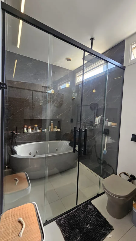 Seu banheiro mais seguro e elegante! Instalação de boxes em vidro temperado com design moderno e acabamento de alta qualidade e durabilidade.